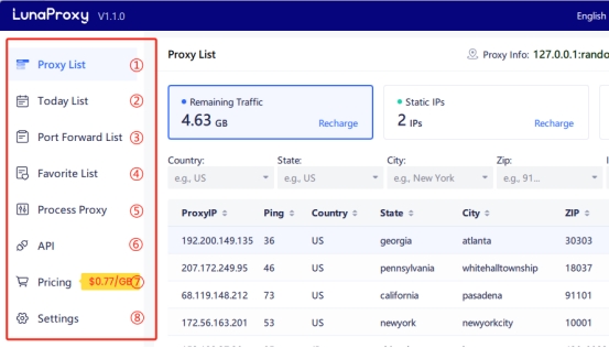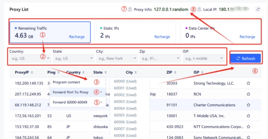 ⑦ Price: Dynamic residential proxy, static residential proxy, and static data center purchase interface