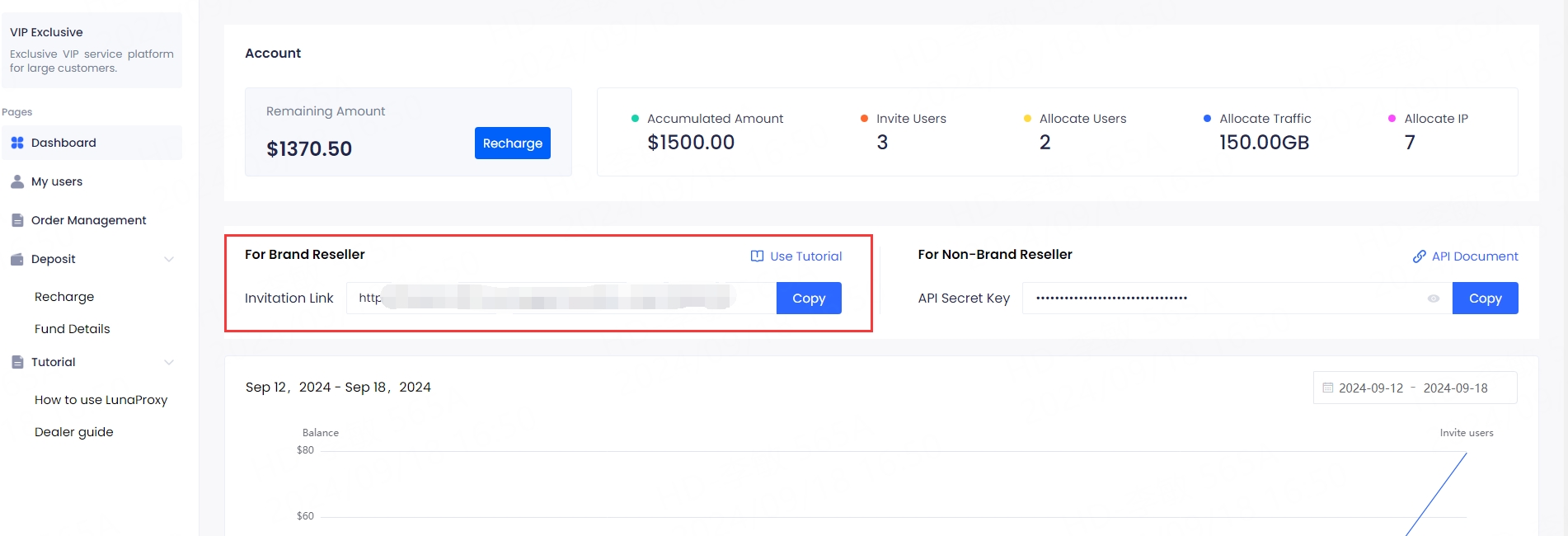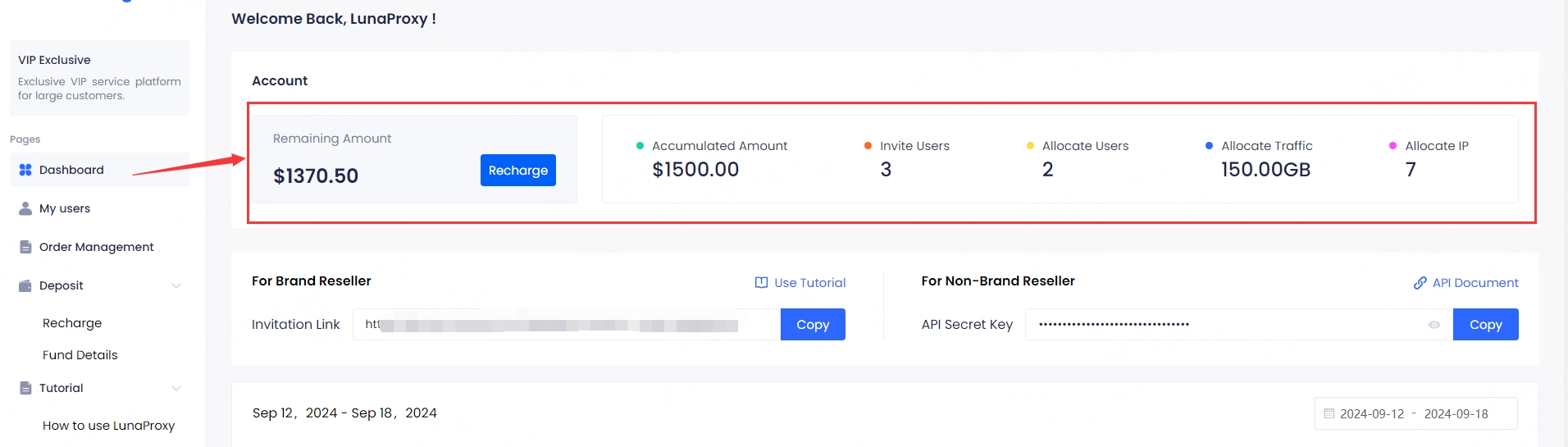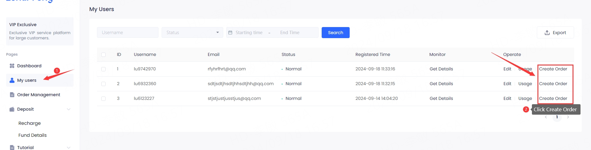 Step 5. Go to [My Users] to allocate traffic or IP to your subordinate users. Click the [Create Order] button and select the user and the quota you need to allocate to the other party. Click Confirm