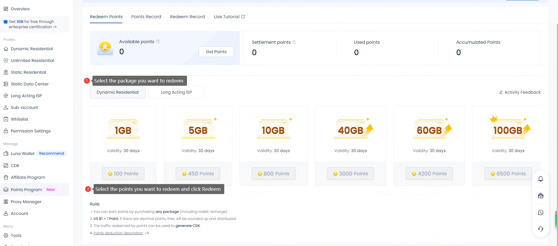 3. If a user maliciously places orders, LunaProxy has the right to cancel his/her eligibility to participate in the points reward program and freeze or clear his/her existing available points; if the above situation occurs and is effectively handled, the account returns to normal and the points will no longer be refunded.