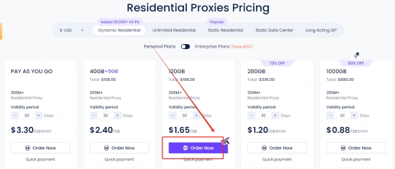 LunaProxy has five proxy packages, including dynamic residential proxy, unlimited proxy, static residential proxy, data center proxy, and rotating ISP proxy. This article takes the purchase of dynamic residential proxy as an example.