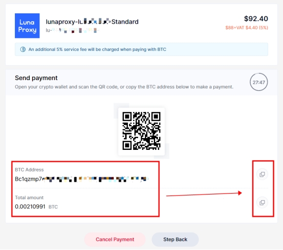 5. Select the type of cryptocurrency you want to use, you can view the payment address and amount, open your encryption wallet and scan the QR code, or copy the address below BTC to make a payment.