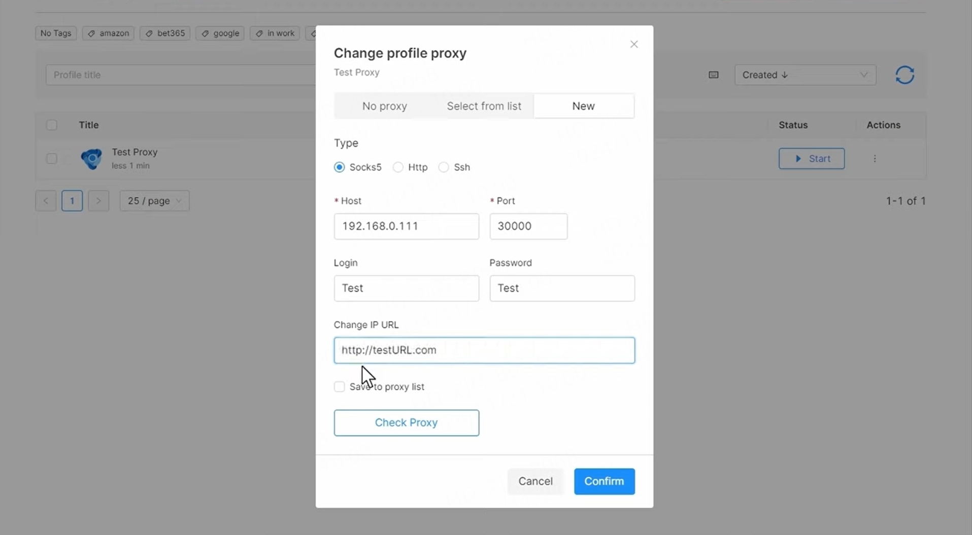 3. Select the proxy type in the pop-up window, fill in the IP and port. If you are using a static IP, you need to fill in the account and password, then click to detect the proxy. After the detection is successful, click OK.