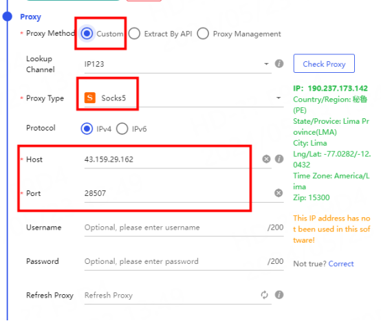 Click Custom Proxy and select the protocol to be used. Here, the socks5 protocol is used as an example