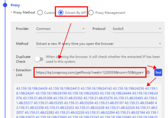 Click Used API Extraction at the proxy and paste the API link to the Extraction Link