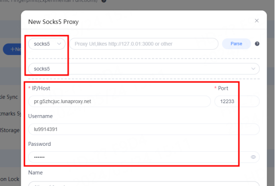 3. Select the protocol according to the needs. Here, take socks5 as an example, and fill in the IP, port, account, and password in the corresponding position