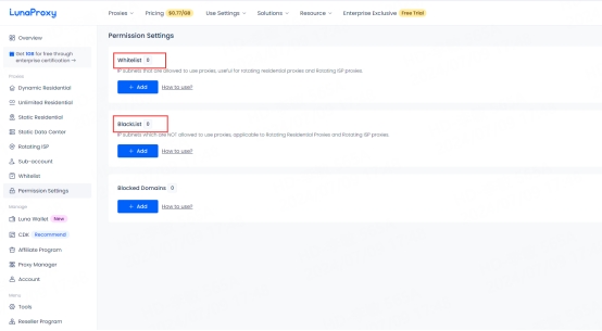 透過在帳戶設定中設定白名單和黑名單可以提高您帳戶的安全性。這些設定將應用於旋轉住宅代理和轮换ISP代理。