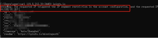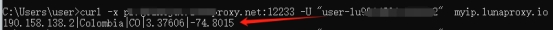 打開命令提示符,輸入以下命令:curl -x IP:PORT ipinfo.io(IP和port位置需要輸入提取的IP和端口,請參考截圖示例),然後按回車鍵