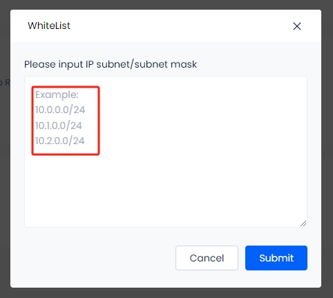 ②按照示例中的格式,將您的本地IP添加至白名單列表中,點擊提交即可