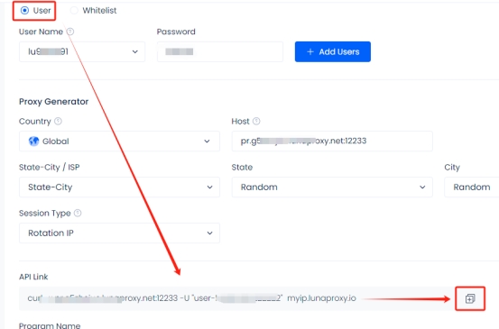 ①進入使用套餐的賬密認證界面,復製API鏈接